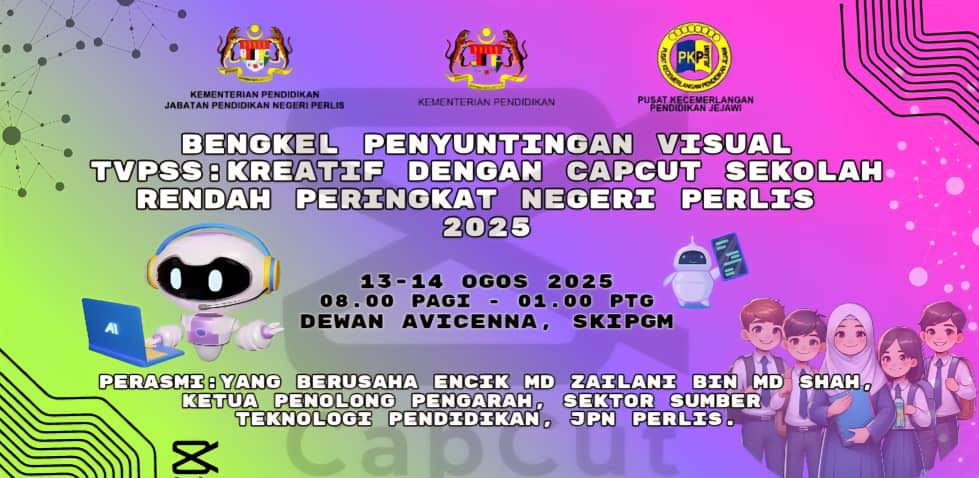 Pihak GPM PKP Jejawi dengan kerjasama SSTP JPN Perlis telah menganjurkan Bengkel Penyuntingan Visual TVPSS: Kreatif Dengan Capcut Sekolah Rendah Peringkat Negeri Perlis seperti butiran berikut: